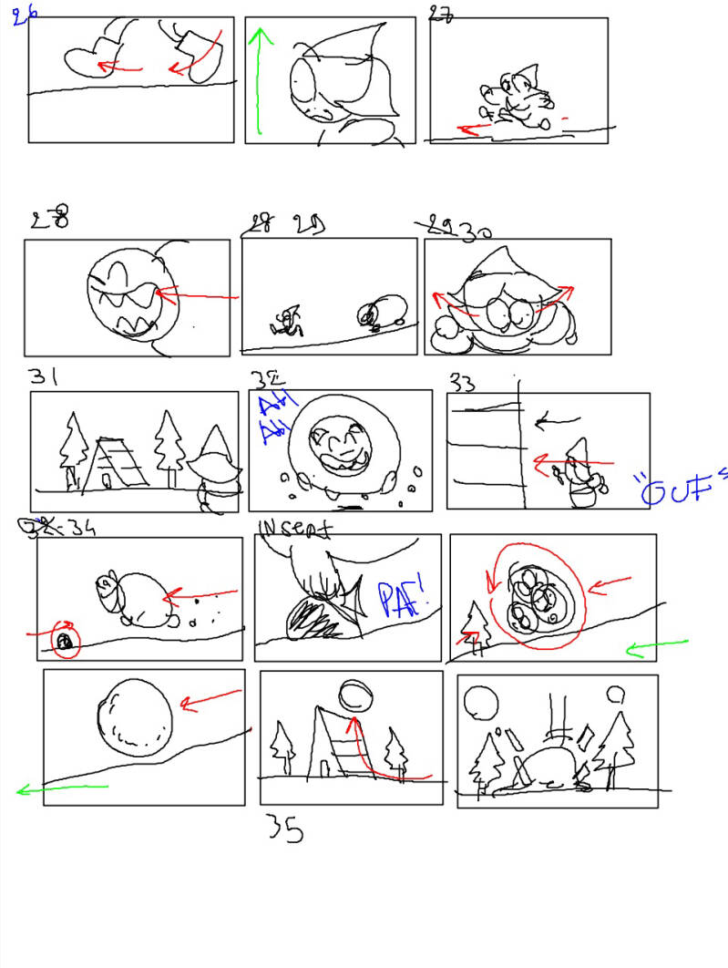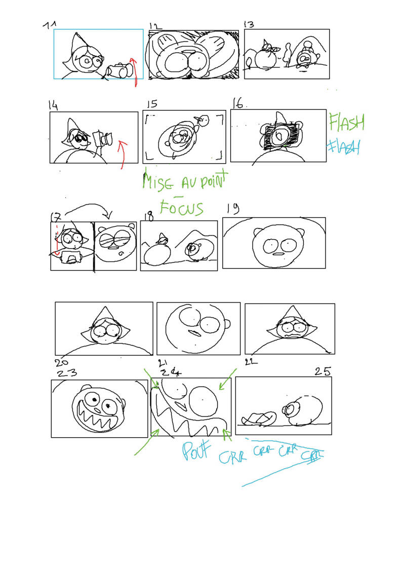 Comment allons nous montrer l'histoire? Voit-on les personnages de loin? de près? Il est ici question du storyboard, une prévisualisation du métrage, façon BD, où nous pouvons réfléchir aux plans et à leurs transitions.