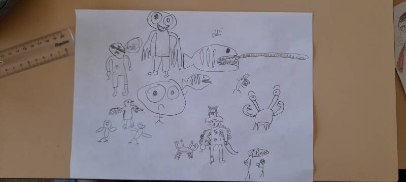 Après nos 3 séances d'écriture, nous savons comment notre pirate à la dérive va être mangé (façon de parler...), mais pas encore comment nous allons le montrer aux futurs-es spectateurs-trices!